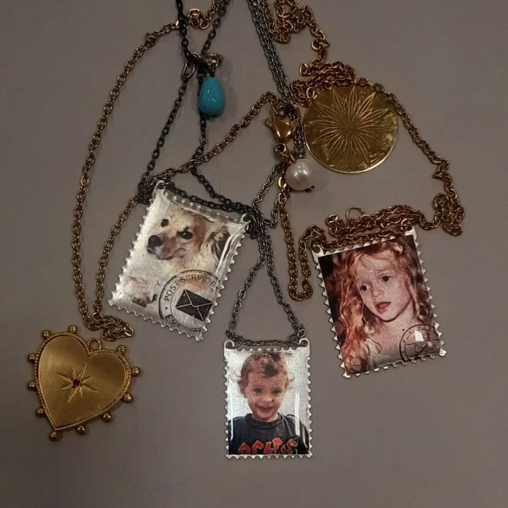 Εκτύπωση σε ασημένιο πλακάκι κομμένο σε σχήμα γραμματόσημου. Κόσμημα κατασκευασμένο εξ ολοκλήρου στο χέρι. Περασμένο με υγρό γυαλί για αντοχή και υπέροχη εμφάνιση. Συνοδεύεται απο ατσάλινη αλυσίδα ή άλλη σύμφωνα με τις απαιτήσεις σας. Ανέβασε την αγαπημένη σου φωτογραφία και φτιάξε κάτι μοναδικό!